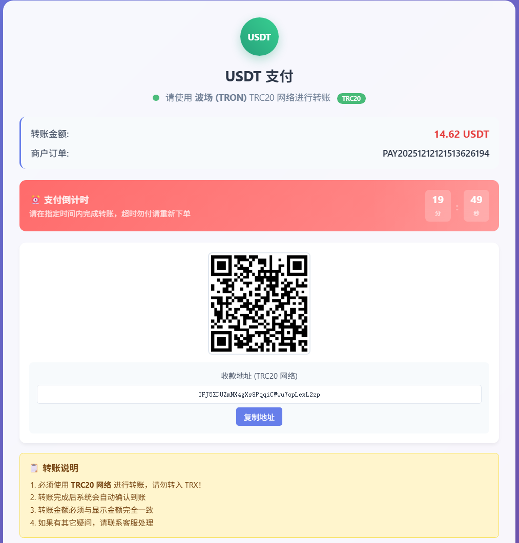 - 金额必须精准匹配订单金额(手续费额外付),否则订单不会标记为成功;