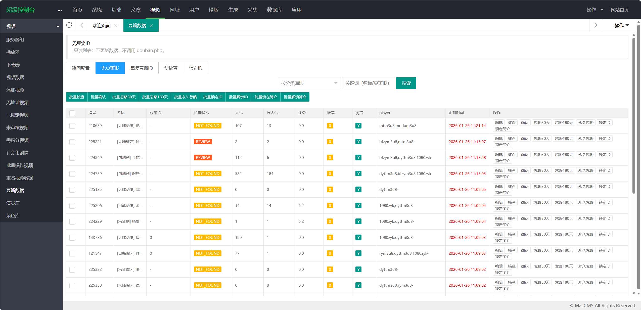 - 提供数据治理功能:无豆瓣ID、豆瓣ID重复、已锁定豆瓣ID、待核查豆瓣ID等列表与批量处理能力。