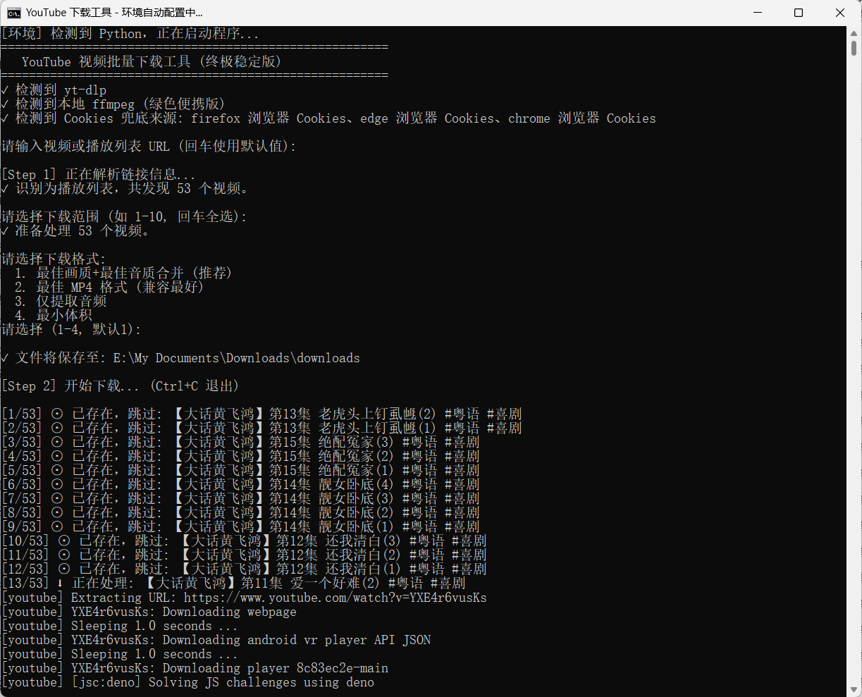 youtube视频下载工具 今天要下载一个youtube视频播放列表,找了之前收藏的在线下载都失效了,github找的YoutubeDownloader.win-x64也不能下载,手搓一个吧: 调用yt-dlp,多线程下载加速、防重名自动跳过,会自动下载 (最高画质纯视频) + (最好音质纯音频),并在后台静默调用 ffmpeg 合并成一个完美的 mp4 文件。 首次运行会检测本地环境:会安装Python、yt-dlp、ffmpeg edge浏览器登录状态测试无错,其他浏览器未测试。 源码: 1775536032-Downloads下载 相关文章•猫盘解析系统(MaoPan)程序下载 2024.10.04 v3.1.3•苹果cms 豆瓣数据自动更新与核查•苹果cms 接入bitmagnet 增加磁力链接搜索下载•苹果cms 视频年份筛选:近10个年份单独列出+按年代筛选•傻瓜式MP4等视频切片工具 - HLS m3u8 播放列表/随机文件名/严格切片•苹果cms对接 BEpusdt USDT/USDC 加密货币收款网关